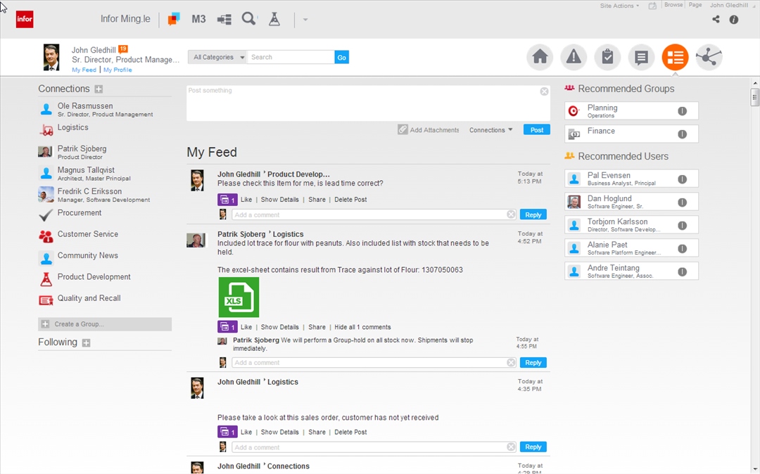 Infor M3 ist die erste ERP-Anwendung innerhalb der kürzlich vorgestellten Infor 10x Suite, die innovative soziale, mobile, Analyse- und Cloud-Technologien bietet. Geplant ist, zusätzlich Infor Ming.le darin zu integrieren: Infor Ming.le ist eine Plattform für ein soziales Netzwerk innerhalb eines Unternehmens, mit dem man enger zusammenarbeiten, Geschäftsprozesse straffen und kontextbezogene Analysen durchführen kann. Nutzer können so Unternehmenswissen erfassen und teilen, Kommunikation mit Geschäftsprozessen verknüpfen sowie Nachrichten, Workflows und Inhalte in Echtzeit verfolgen.