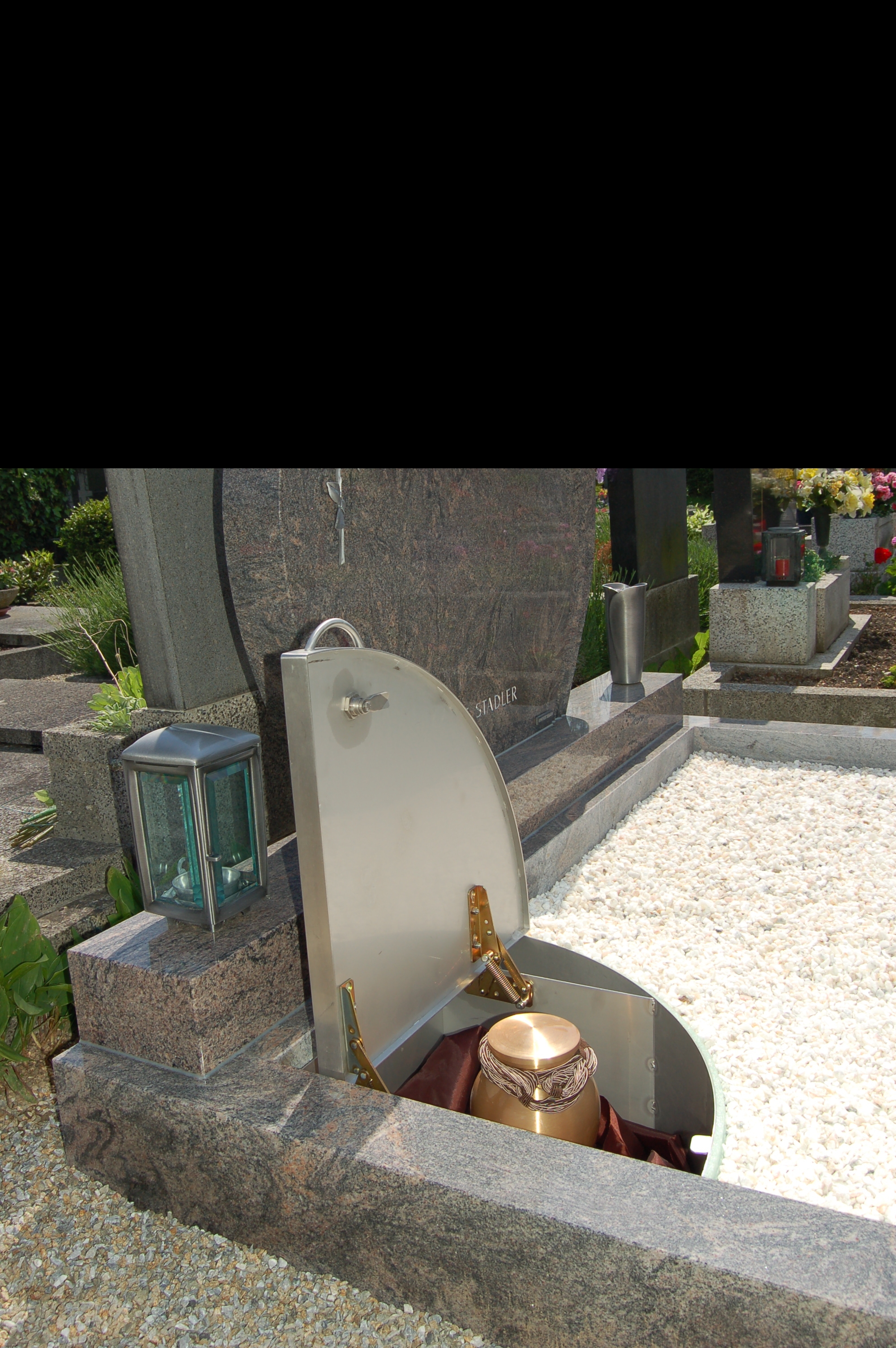 Die Urnenbox ist als ¼-Kreis erhältlich. Mit einer Winkellänge von 50 oder 60 cm. Rechtecke und Sonderformen sind auf Anfrage möglich. Material: Nirosta. Die Urnenbox ist absperrbar. Der Deckel kann individuell gestaltet, graviert und dekoriert werden.