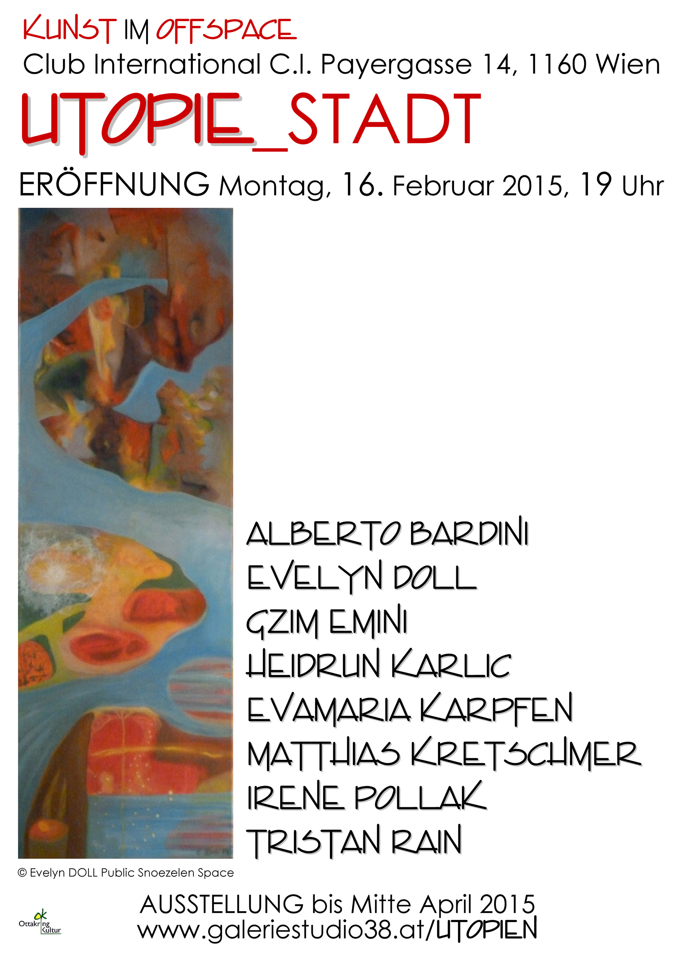 Am 16.Februar wird im Offspace Club International in Wien Ottakring die erste von drei Gruppenausstellungen zum Jahresthema 2015 UTOPIEN eröffnet. Mit „UTOPIE_Stadt“ setzen sich 8 Künstlerinnen und Künstler – Alberto Bardini, Evelyn Doll, Gzim Emini, Heidrun Karlic, Evamaria Karpfen, Matthias Kretschmer, Irene Pollak und Tristan Rain – auseinander.