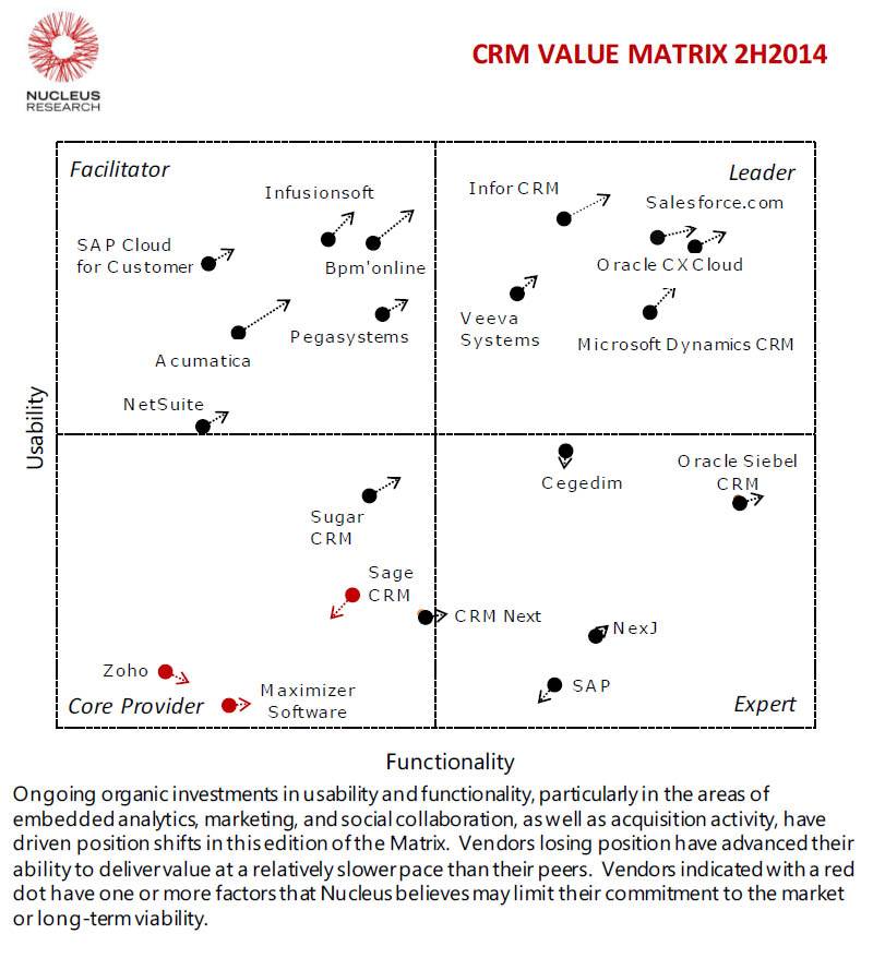 München, 23. Oktober 2014 – Infor CRM wurde in der neuesten Technology Value Matrix von Nucleus Research als führende Lösung für Customer Relationship Management eingestuft. Nucleus Research positionierte verschiedene Anwender in der Leader-Kategorie. Entscheidend sind dabei Benutzerfreundlichkeit und Funktionalität in den drei Säulen des CRM: Vertrieb, Marketing und Kundenservice.