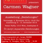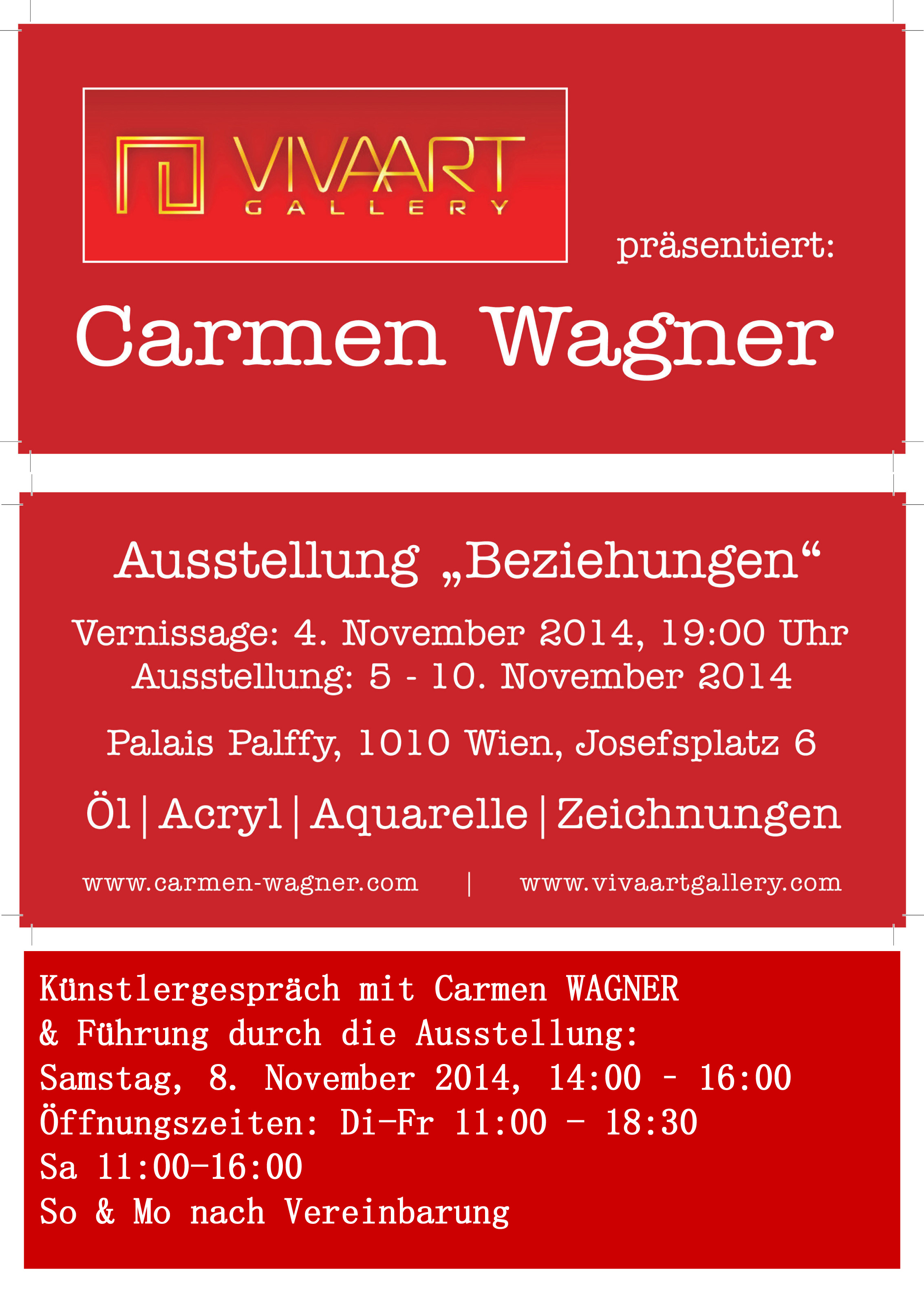 VERNISSAGE am Dienstag, 4. November 2014, 19:00 Palais Palffy, Josefsplatz 6, 1010 Wien Ausstellung: Mittwoch, 5. – Montag, 10. November 2014 Künstlergespräch mit Carmen WAGNER & Führung durch die Ausstellung: Samstag, 8. November 2014, 14:00 – 16:00 Öffnungszeiten: Di-Fr 11:00 - 18:30, Sa 11:00-16:00, So & Mo nach Vereinbarung