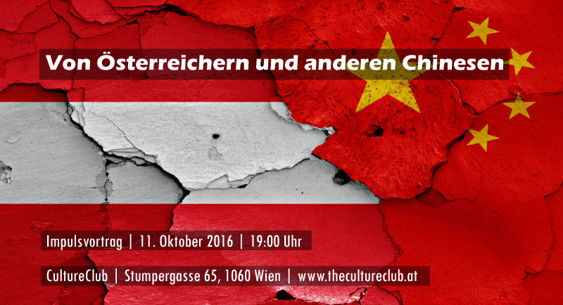 In 90 Minuten, wird nicht nur das fremde China näher gebracht, sondern auch das eigene kulturelle Spiegelbild entzerrt. Der Impulsvortrag findet am 11. Okt. 2016 um 19:00 Uhr bei CultureClub (Stumpergasse 65, 1060 Wien) statt. Die Teilnahme ist kostenlos, um Anmeldung auf der Webseite von Culture Club wird jedoch erbeten.