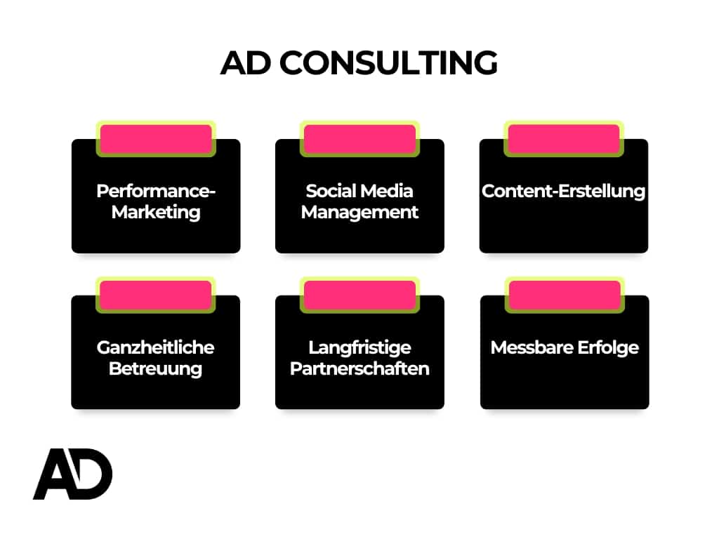Performance-Marketing: AD Consulting erreicht die Zielgruppen ihrer Kunden durch gezielte, organische und bezahlte Anzeigen auf Plattformen wie Instagram, Facebook, LinkedIn und TikTok. Sie übernehmen die Account-Betreuung und stellen sicher, dass die Anzeigen zur richtigen Zeit an den richtigen Orten geschaltet werden.