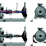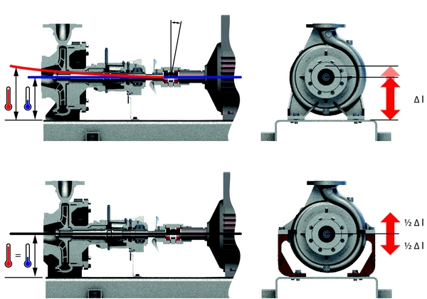 Hohe Temperaturen des Wärmträgeröls mit bis zu 350 °C führen naturgemäß zur Ausdehnung des Spiralgehäuses. Durch diese Ausdehnung neigt und biegt sich die Welle der Pumpe – während die Motorwelle weiterhin parallel zur Grundplatte bleibt. Je größer das Spiralgehäuse, desto mehr wird die vertikale Wärmeausdehnung zu einem relevanten Problem. Bei den Pumpen mit dem Lagerträger 470 hat Speck Pumpen jetzt eine achsmittige Aufhängung der Spiralgehäuse entwickelt. Diese Aufhängung eliminiert die Auswirkung der vertikalen Ausdehnung vollständig. Die Welle ist auch im Heißbetrieb immer optimal in der Höhe ausgerichtet. Lager und Kupplung werden signifikant entlastet und erreichen eine wesentlich längere Lebensdauer. Wie bei den bisherigen Gehäusen entsprechen auch bei neuen Gehäusen mit achsmittiger Aufhängung die Anschlussmaße der Norm EN 733. Somit ist die Austauschbarkeit mit anderen Normpumpen jederzeit gewährleistet.