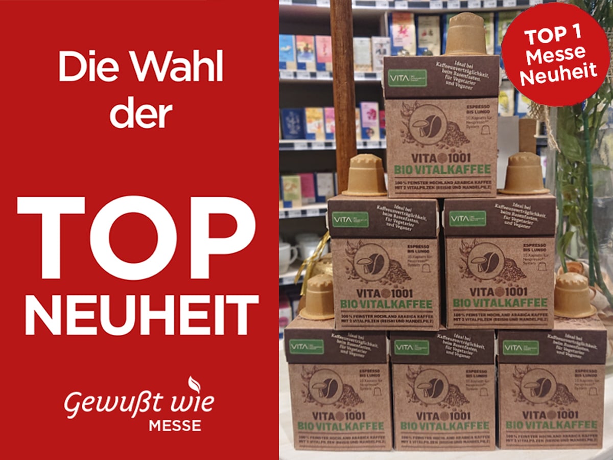 So freut uns auch die Anerkennung, auf der „Gewusst wie Gesundheits“-Messe 2022 in Bad Schallerbach den 1. Platz der Top-Neuheiten mit dem VITA1001 – Bio Vitalkaffee in einer 100% kompostierbaren Holzfaser-Espresso-Kapsel belegt zu haben.