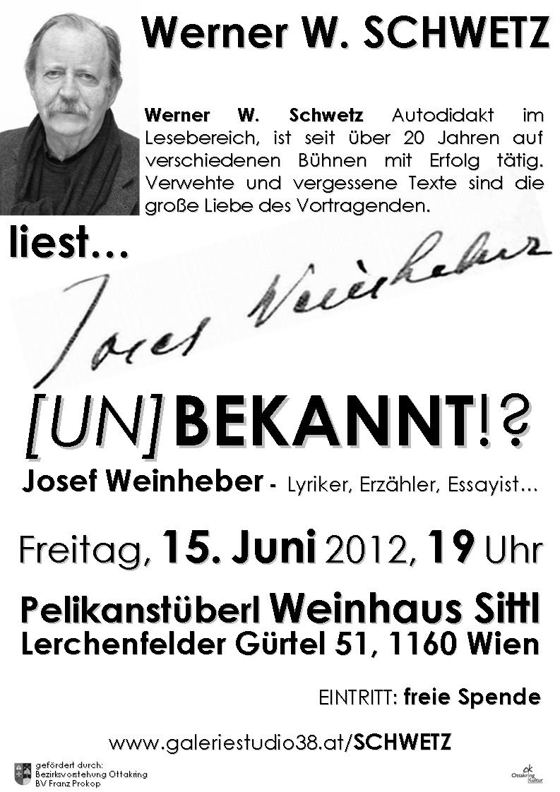 Freitag, 15. Juni 2012, 19 Uhr - Werner W. SCHWETZ liest… Josef Weinheber [UN]BEKANNT!? Bekannte und vergessene Texte des Lyrikers und Erzählers. Pelikanstüberl, Weinhaus Sittl, Lerchenfelder Gürtel 51, 1160 Wien - Eintritt: freie Spende