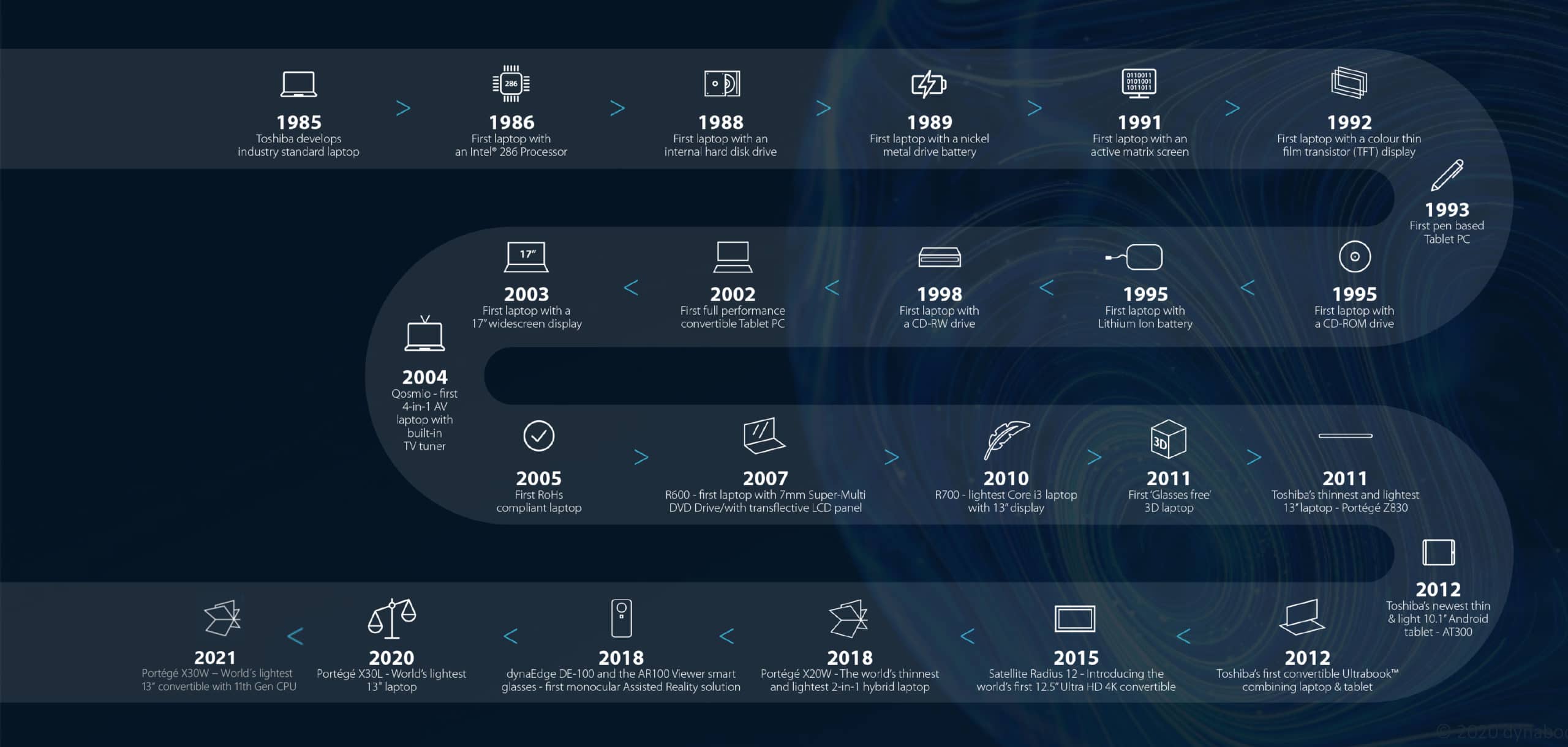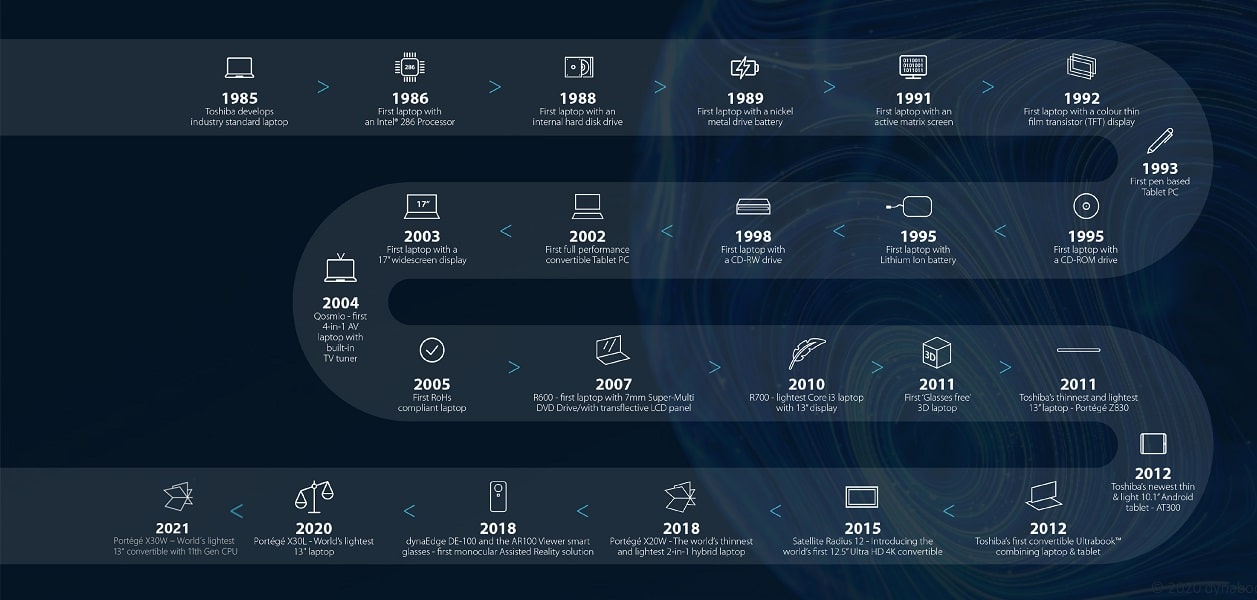 Dynabook – früher Toshiba – blickt auf über drei Jahrzehnte mit zahlreichen Meilensteinen und Branchenneuheiten zurück. Damit legt der Hersteller stets wichtige und neue technologische Grundsteine und treibt den mobilen Computing-Markt maßgeblich voran. Ein Auszug: