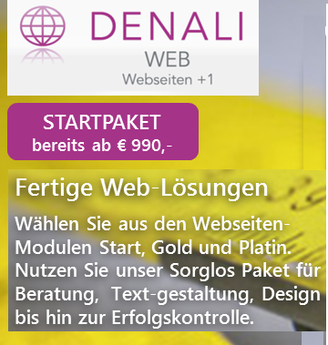 DENALI bietet als Agentur fertige Lösungen für Ihre effektive Internetpräsenz . Wählen Sie aus erfolgserprobten Modulen für die Erstellung Ihrer Homepage. Nutzen Sie unser Komplett-Paket von der Beratung über die Textgestaltung, Design und die Programmierung bis hin zur Erfolgskontrolle.