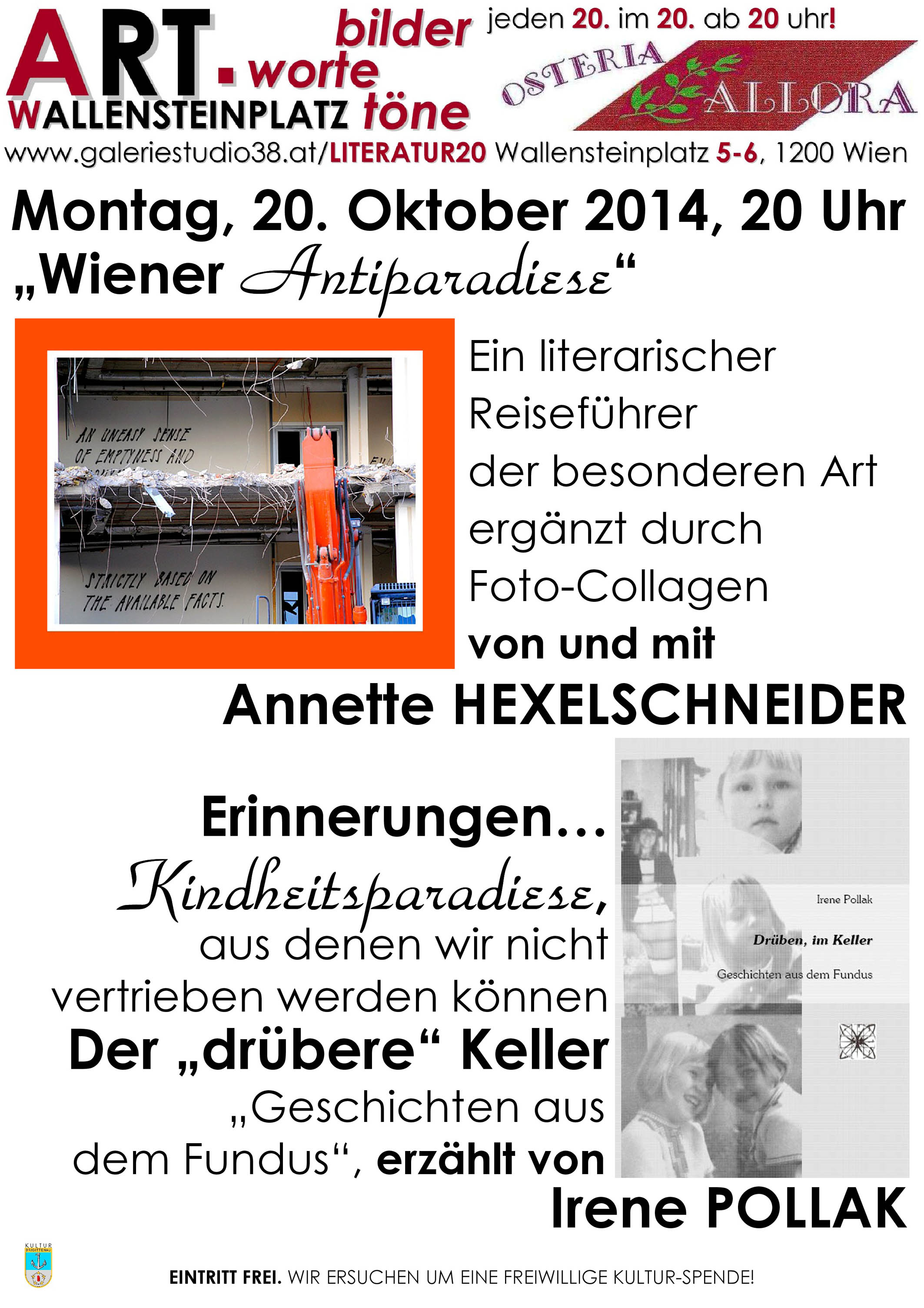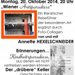 Am 20.Oktober stellt Annette Hexelschneider neue Texte und Foto-Collagen ihrer „Wiener Porträtgalerie“ beibilder.worte.töne vor. Irene Pollak präsentiert ihren neuen Erzählband „Drüben im Keller“, eine Sammlung von Kindheitserinnerungen, Familiengeschichten und Texten, die sie für verschiedene Anlässe geschrieben hat.