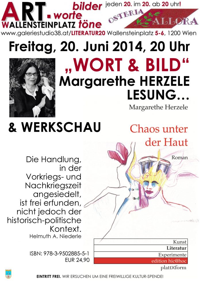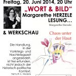 Am20. Juni liest Margarethe HERZELE bei bilder.worte.töne aus ihrem Roman „Chaos unter der Haut“, der 2012 erschienen ist. Nach einer Reihe kleinerer Publikationen mit Lyrik und Prosa liegt nun ihr umfangreiches Prosawerk vor.Der Roman ist ein radikales poetisches Bekenntnis der Schriftstellerin und Künstlerin, die sich nie mit Halbheiten zufrieden gegeben hat. Der Leseabend steht unter dem Motto „Wort & Bild“ – Margarethe HERZELE zeigt auch eine Werkschau ihrer bildnerischen Arbeiten.