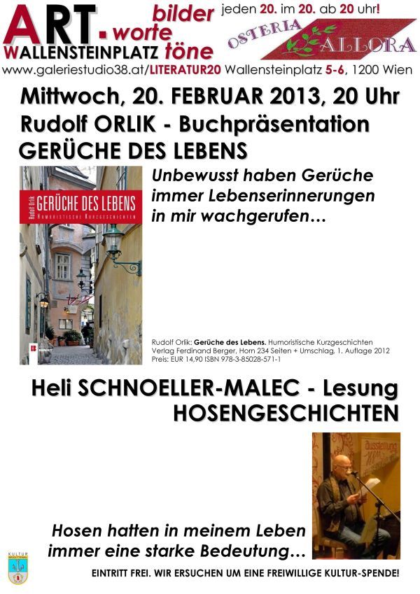 Der Autor Rudolf Orlik präsentiert sein im Verlag Berger erschienenes Erstlingswerk humoristischer Kurzgeschichten „Gerüche des Lebens“. Der Künstler Heli Schnoeller-Malec lässt Kindheit und Jugend der 50er, 60er und 70er Jahre in seinen „Hosengeschichten“ Revue passieren.