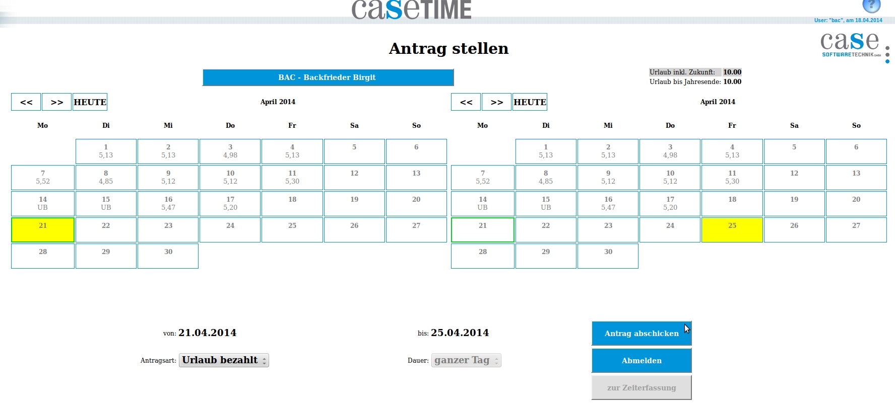 caseTime Zeiterfassung bietet mit dem Modul URLAUBSWORKFLOW ein einfaches Werkzeug, mit dem ein/e MitarbeiterIn ohne viel Aufwand einen Antrag auf Urlaub, Zeitausgleich etc. an den zuständigen Urlaubsverantwortlichen stellen kann.