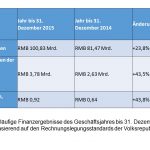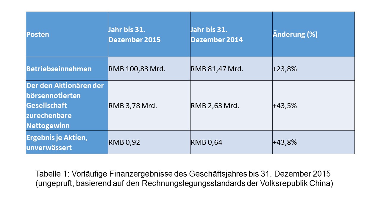 Tabelle 1: Vorläufige Finanzergebnisse des Geschäftsjahres bis 31. Dezember 2015 (ungeprüft, basierend auf den Rechnungslegungsstandards der Volksrepublik China)
